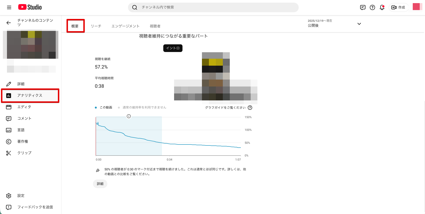 そこで活用できるのが、YouTube Studioの「アナリティクス」です。