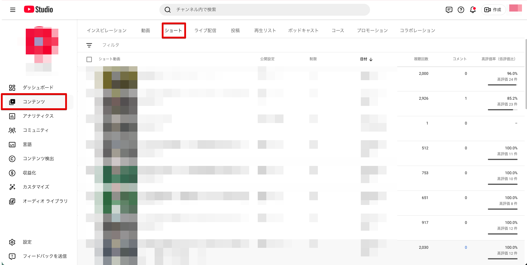 YouTube Studioに入って「アナリティクス」をクリックすると、実際に現在出ているショート動画のデータを確認できます。
