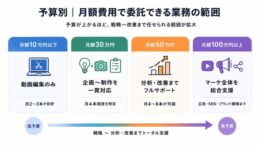 ただし同じ「月30万円」でも、撮影が含まれるかどうか、月に何本の動画を制作するかによって内容は大きく異なる点に注意してください。費用だけで比較するのではなく「何が含まれていて、何が含まれていないか」を必ず確認することが重要です。