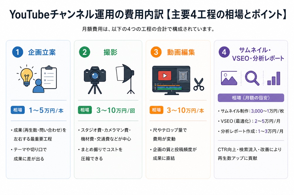 YouTubeチャンネル運用の月額費用は複数の工程の合計で構成されています。