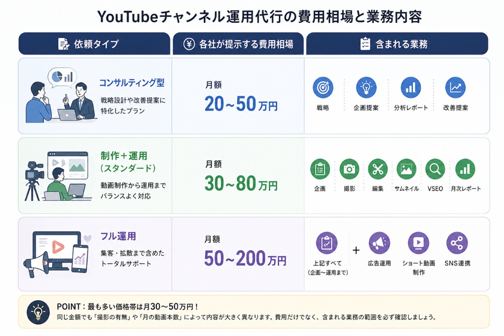 動画マーケティング会社が提示するYouTubeチャンネルの運用代行費用は、依頼する業務範囲によって幅広く設定されています。以下の表で、代表的な依頼タイプ別の相場と含まれる業務を整理しました。